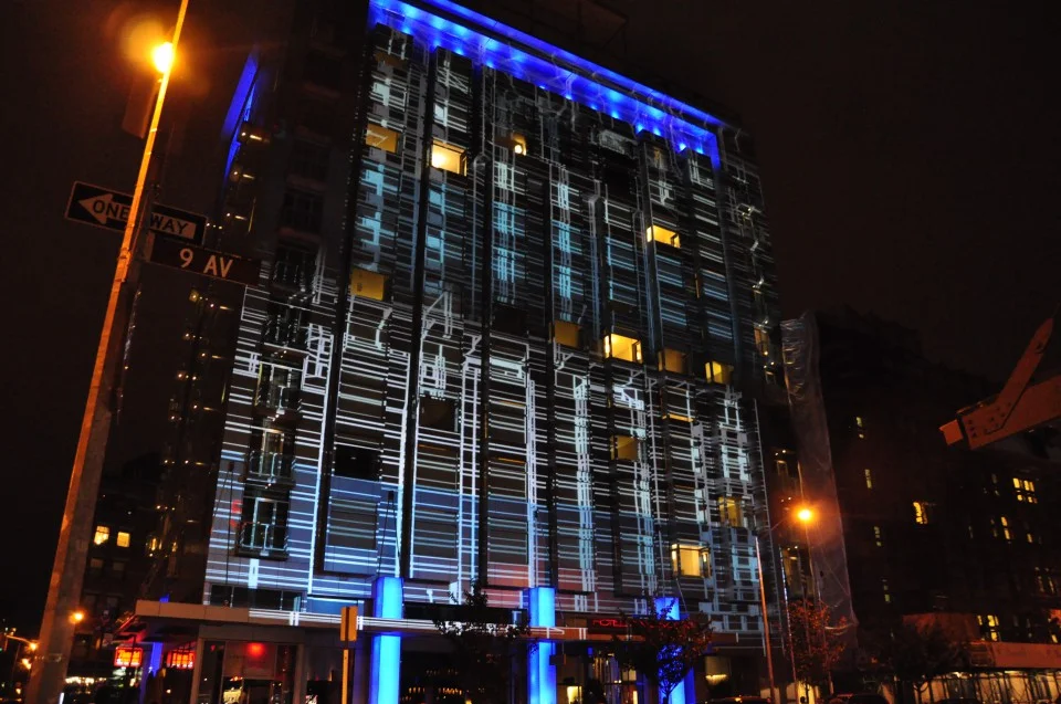The 15 story façade of the well-known Hotel Gansevoort was transformed into a dynamic animated canvas, as crowds of thousands quickly gathered in the street to watch. Working with a select team of international content developers, this art installation presented both creative and technical challenges as our production team worked against the clock and the weather to transform the 120’ wide building into a magical nighttime spectacle.